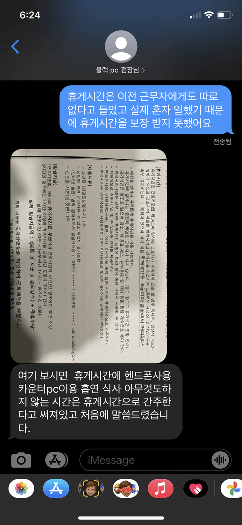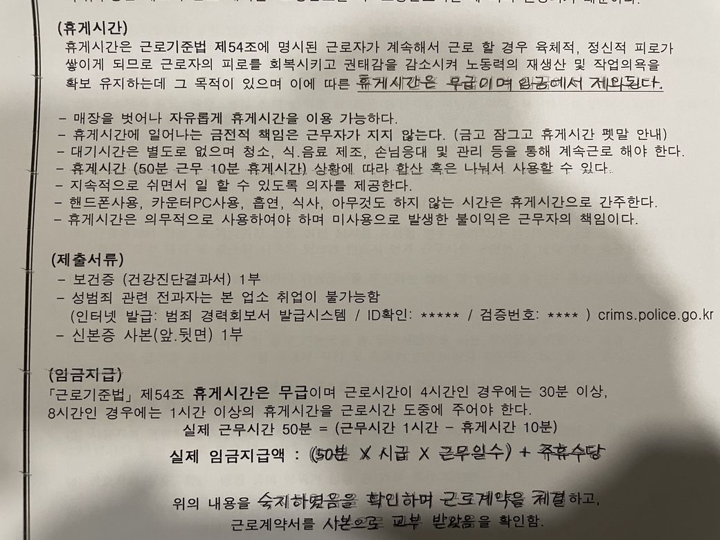 계약서에 적혀있는 휴게펫말은 본적도 없고 점장에게 언급받은 적도 없습니다. 손님이 없어도 항시 카운터에서 주문과 손님을 대기했습니다. 휴게시간에 대한 조항에 '계속 근로해야 된다'는 문구도 적법하지 않다고 생각합니다.