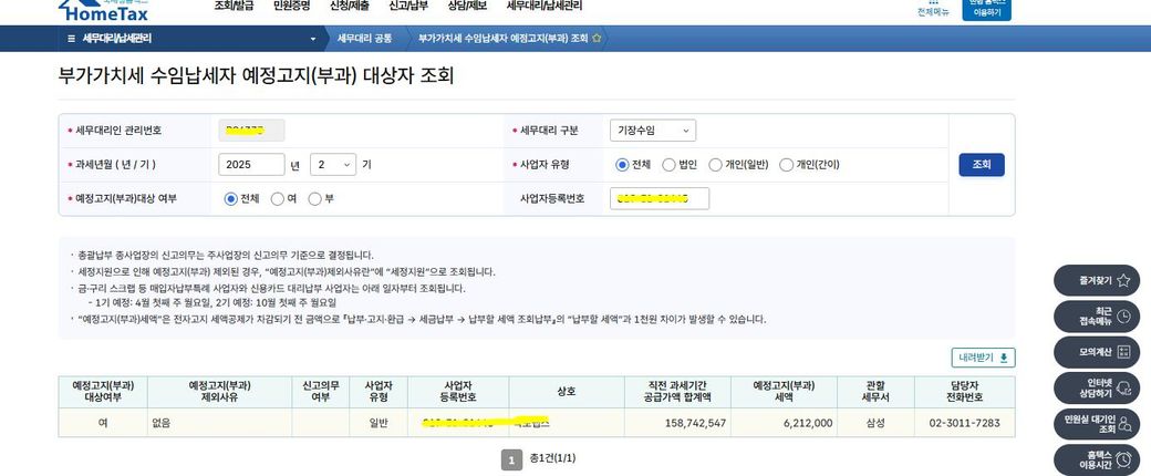 홈택스>세무대리인전용화면>세무대리/납세관리>부가가치세 수임납세자 예정고지 조회