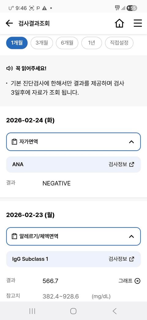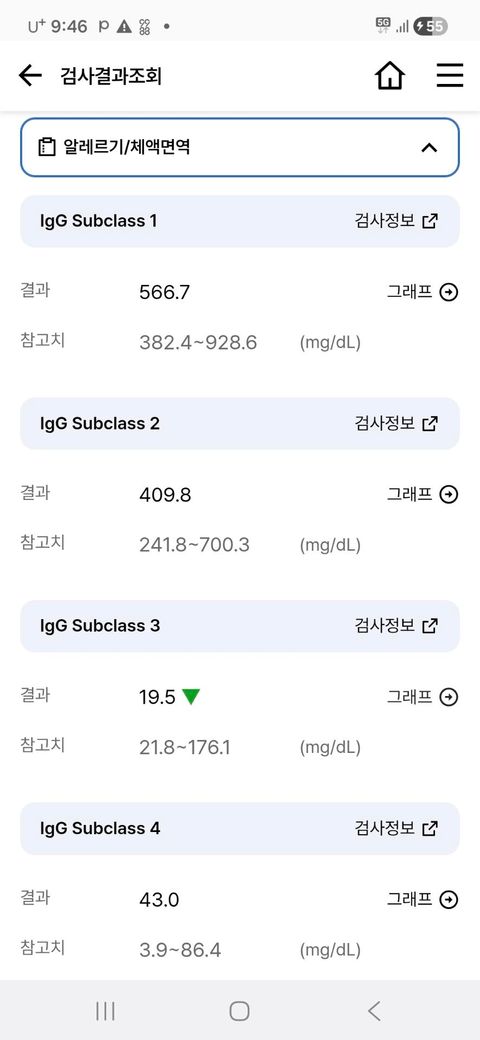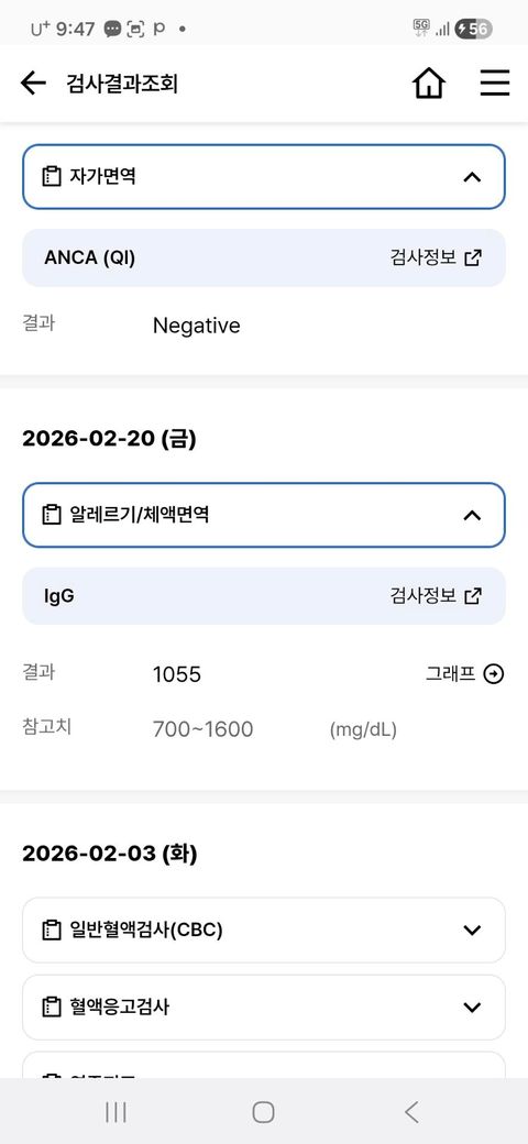 우선 혈액검사입니다. 총 IgG는 1055 mg/dL로 참고치 700에서 1600 범위 내 정상입니다. IgG subclass 1, 2, 4도 모두 정상 범위입니다. IgG subclass 3이 19.5 mg/dL로 참고치 21.8에서 176.1보다 약간 낮게 나왔으나, 단독의 경미한 감소는 임상적 의미가 거의 없는 경우가 대부분입니다. 반복적인 세균 감염 병력이 없다면 치료 대상이 되지 않습니다. ANA와 ANCA가 모두 음성으로, 전신 자가면역질환이나 혈관염을 시사하는 소견은 없습니다.