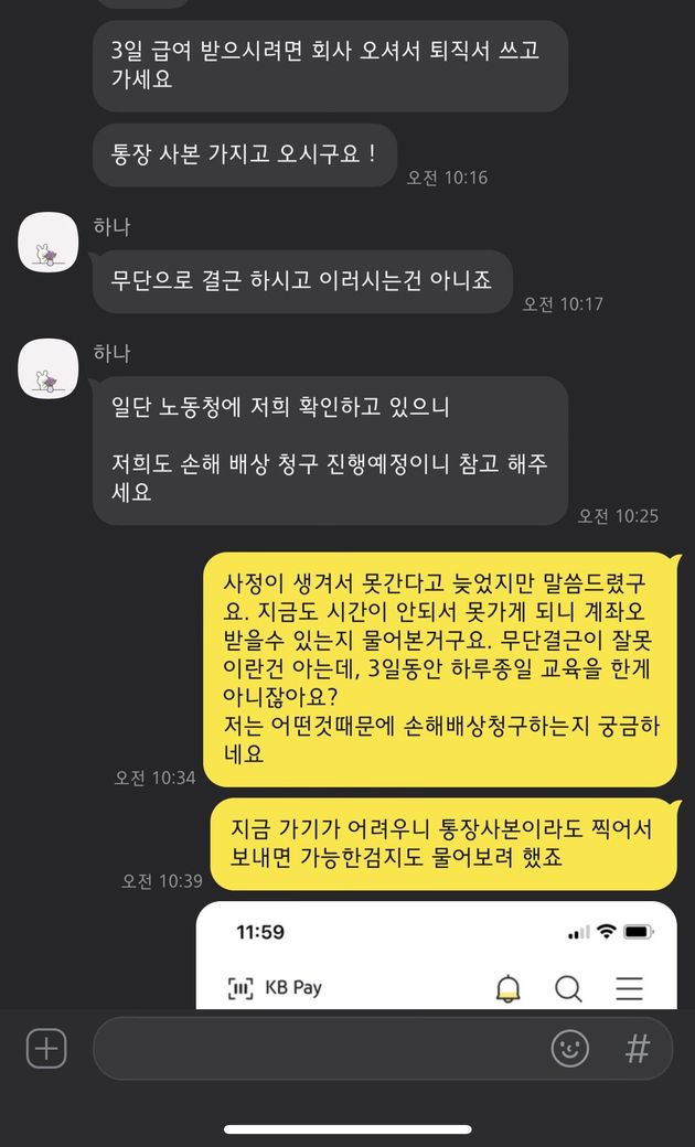 그 후에 사정이 생겨서 그만둔다고 카톡으로 당일오전에 얘기드렸구요. 3일 일한건 어떻게 되는지 물어봤어요.