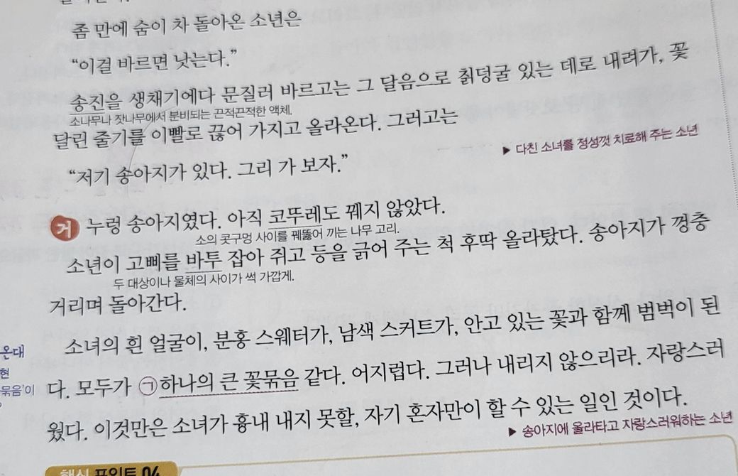 소녀가 같이 탄 것은 아니고요 소년이 올라 탔을 때 송아지가 껑충 거리며 뛴다고 했고 그러면서 송아지에 타고있는 소년의 시야가 위아래로 어지럽게 흔들리니 소녀의 형상이 흐트러져 보이면서 하나의 꽃 묶음 처럼 보였다는 뜻 같네요