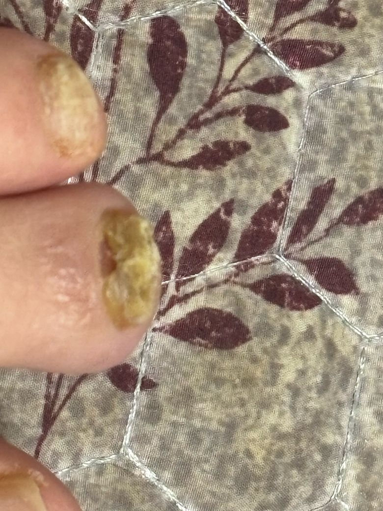 사진상 발톱은 황색 변색, 두꺼워짐, 부스러지는 양상이 뚜렷하여 조갑진균증 가능성이 높습니다. 단순 변색이 아니라 각질이 쌓이고 구조가 망가진 상태로 보입니다.