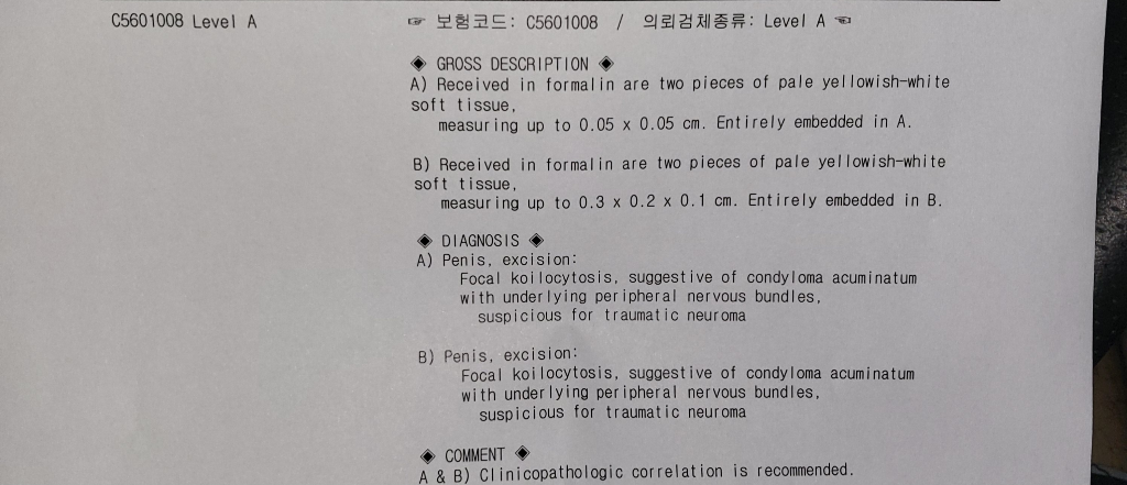 말씀대로 결과지에 애매한 이야기가 적혀있습니다. 곤지름이 맞을수도 있고 아닐수도 있으니 임상의사가 판단하라는 의미입니다. 당장 할 수 있는 것은 병변이 더 커지지 않는지 지켜보는 것이고, 병변이 커지면 그 때 곤지름이라 확실히 진단한 뒤에 치료받아야 할 것으로 보입니다.