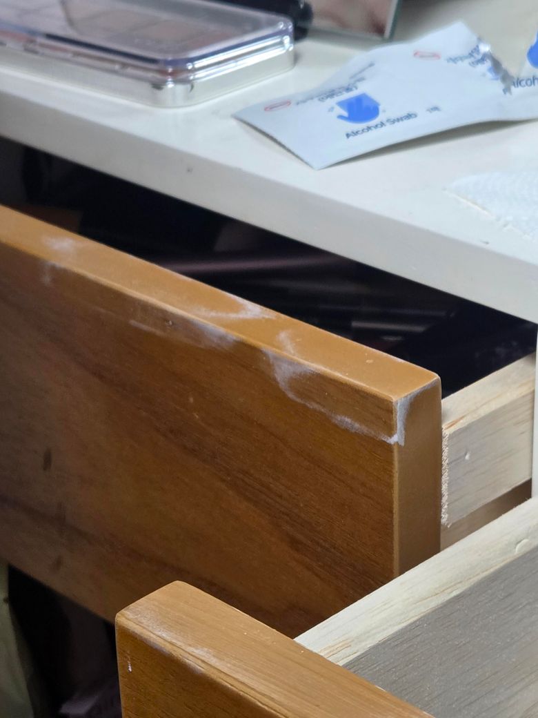 알콜솜으로 가구 표면을 닦으시면서 알콜이 목재에 소량 스며들며 화학반응이 일어나 하얀거품이 일었고