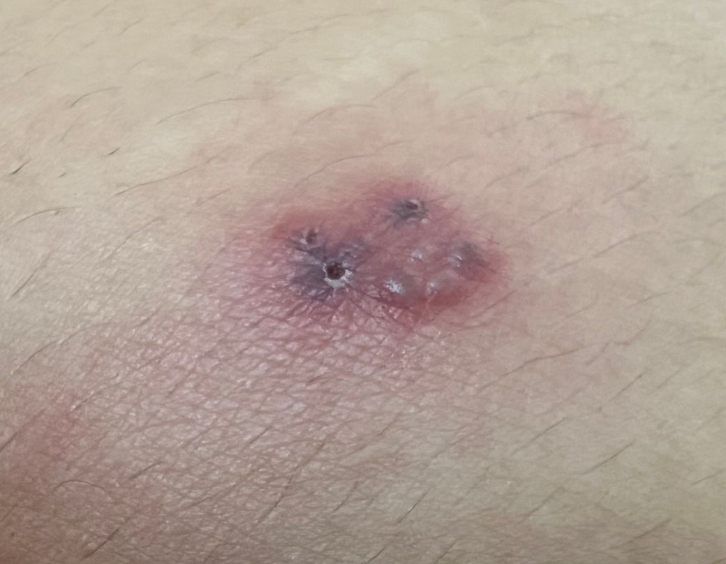 오돌토돌한 검은색 점이 있는 듯한 붉은 상처가 생겼습니다.
