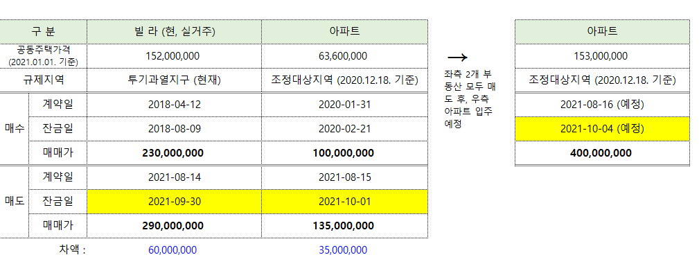 아래 표로 정리한 것처럼 2주택 모두 처분 후 경기도 소재 아파트를 매입할 예정이구요~