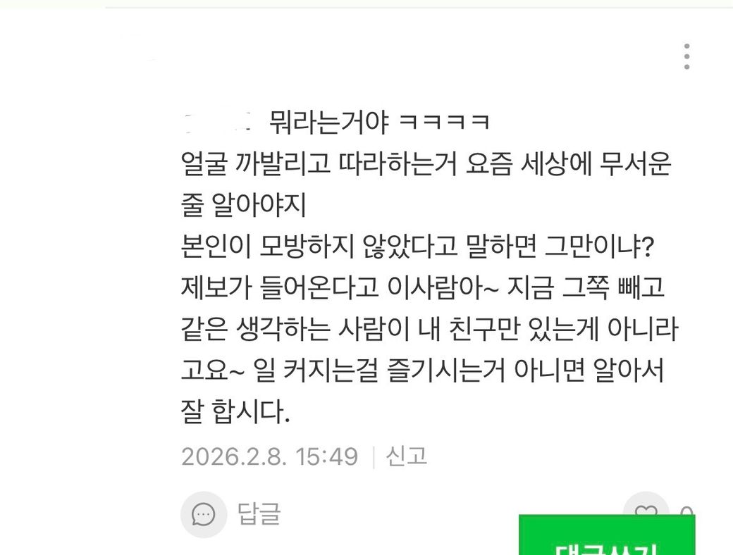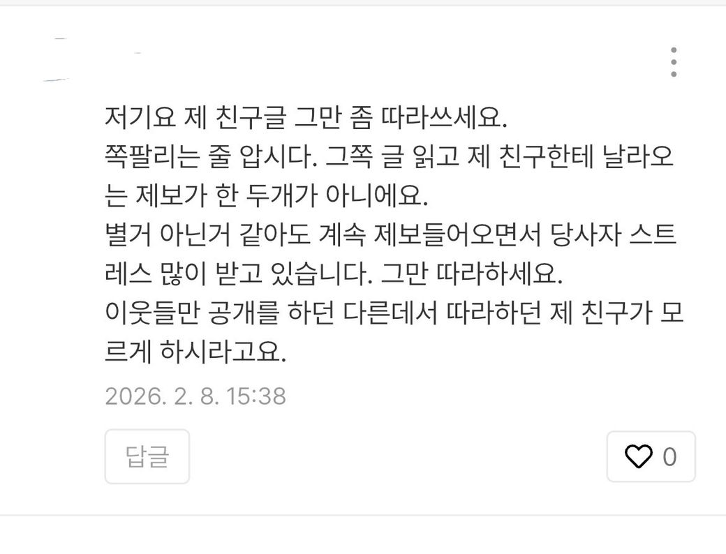 이미 당사자랑 얘기 끝난 상황인데, 제 3자인 상대방 친구가 제 블로그에 와서 공개 댓글로 이러고 있는 상황입니다. 신고나 고소 가능한가요?
