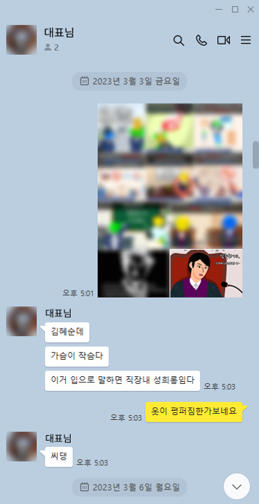 2. 2022년 하반기 / 사무실 내에서 본인의 파티션에 사업주가 팔짱을 낀 채로 걸쳐놓고 인중에 피가 맺혀있는 본인을 바라보며, "어제 밤에 무슨 일이 있으셨길래~?"라며 음흉한 미소를 띄움