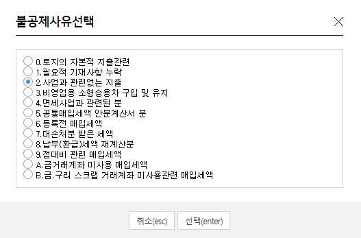 사업과 무관한 지출로 선택하셔서 부가가치세 불공제 받으시면 됩니다.