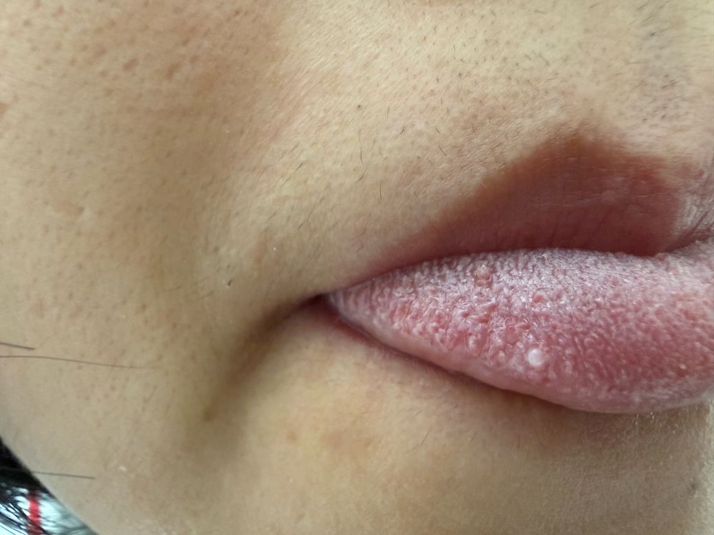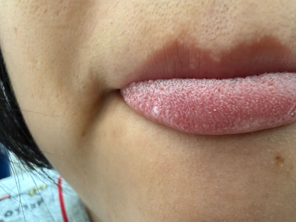 사진상 혀 전면에 다수의 작은 백색 돌기와 그 중 일부는 약간 돌출된 형태로 보입니다. 전반적으로 균일하게 분포한 점과 표면 질감으로 보아, 단일 종괴보다는 설유두(혀 돌기)의 변화로 해석하는 것이 더 타당합니다.
