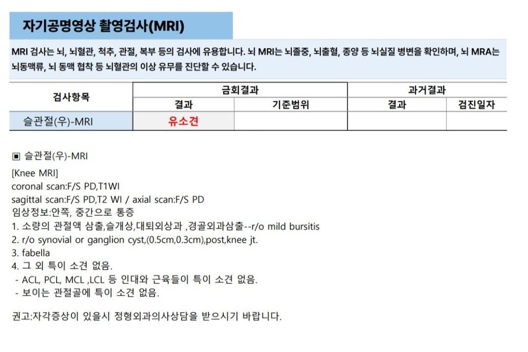 무릎 mri 를 찍었는데 판독지에 유소견이라고 떠 있어요..