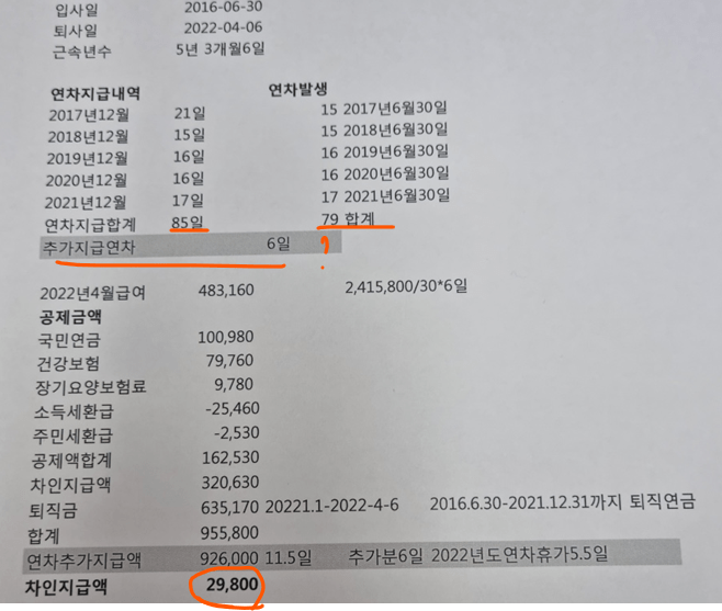 + 올해 연차 사용분 5.5개를 추가지급액으로 산정하면서 4월 급여+퇴직금 (22.1~22.4)에서