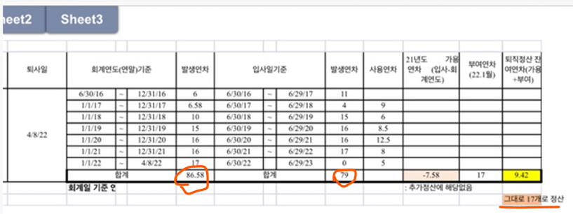 참고로 근로자에게 유리하게 적용하기 위해서 통상적인 계산법에 의하면 회계년도 기준 발생연차와 입사일 기준 발생연차 중 비교하여 근로자에게 유리한 것으로 산정해 줘야한다고 알고 있는데, 되려 입사일기준으로 79개이고, 연차지급내역으로 85개라면서 6개를 차감지급해야하고, 22년도 사용연차 5.5개를 또 차감지급 해야한다는 계산이 법적으로 가능한 얘기인가요??? 저는 도무지 이해가 안가는 이전 회사의 계산법에 대응할만한 방법을 문의드리고자 합니다. ㅠㅜ