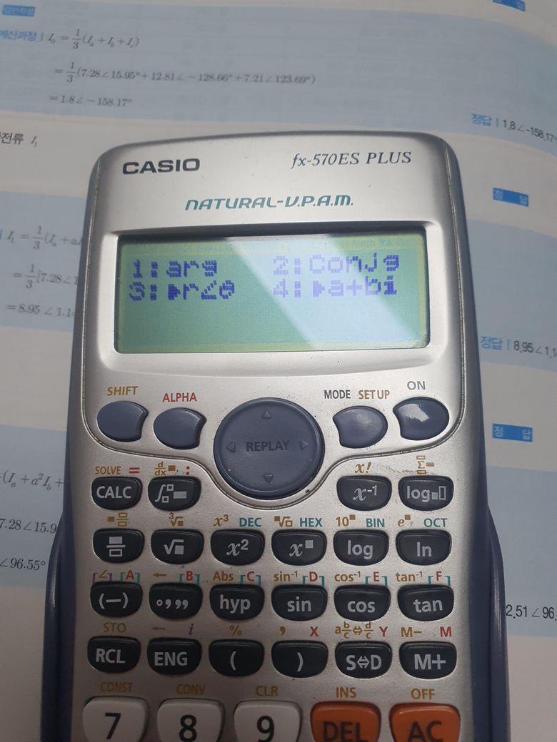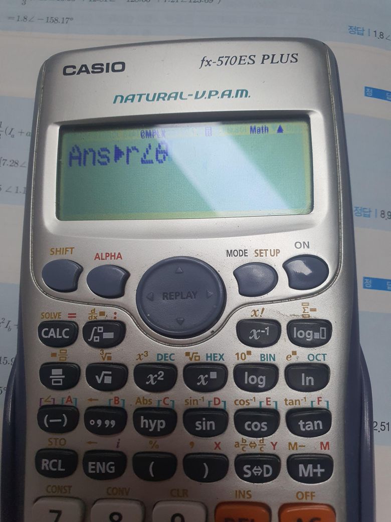 극좌표 변환 기능 실행 방법으로는 SHIFT + (+) 또는 SHIFT + (-) 또는 CMPLX 메뉴에서 r∠θ 선택 합니다.
