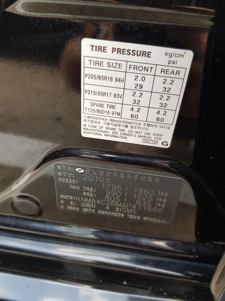안녕하세요. 자동차 sm5 2010년식 공기압 앞 32 뒤 32 넣어주시면 됩니다. 참고하시구요.
