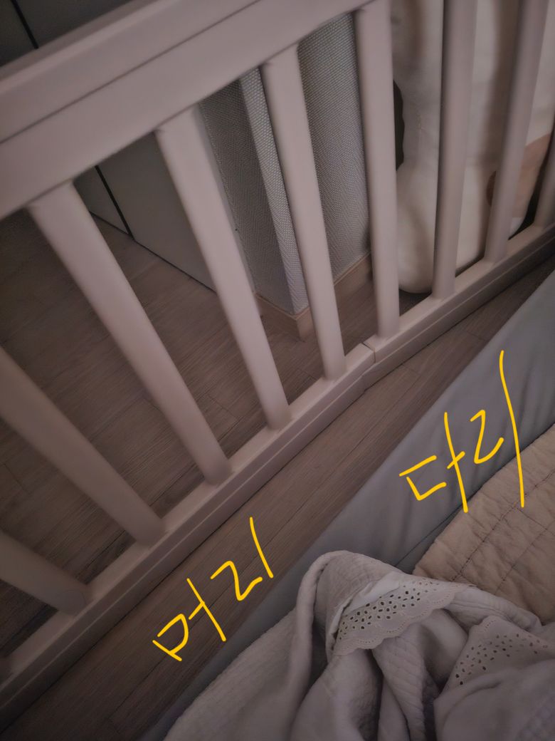 그때랑 비슷한데 오늘은 사진에 있는 공간에 곧 20개월 아기가 머리는 바닥에 다리는 매트리스 위로 해서 자고 일어났어요!
