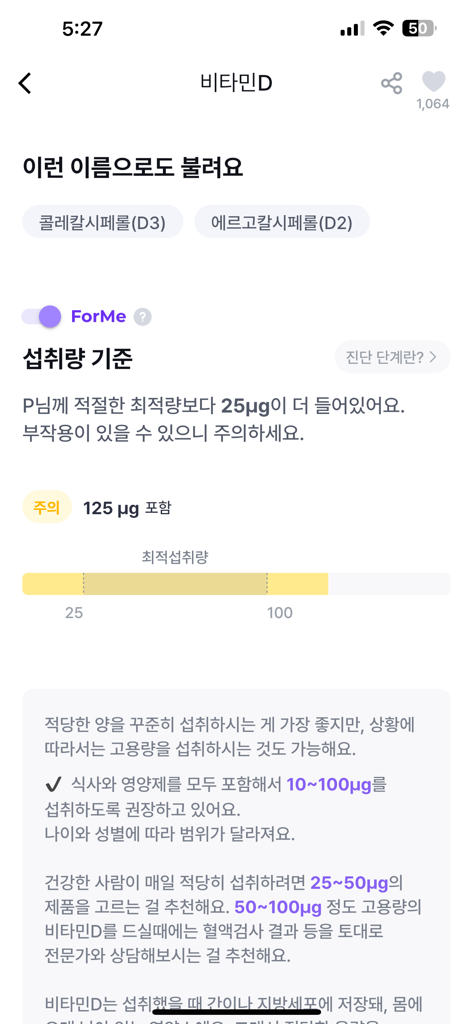현재 복용 중인 비타민D의 함량은 5,000IU에 해당하는 양으로 1일 최대권장량인 4,000IU를 초과하는 양입니다.