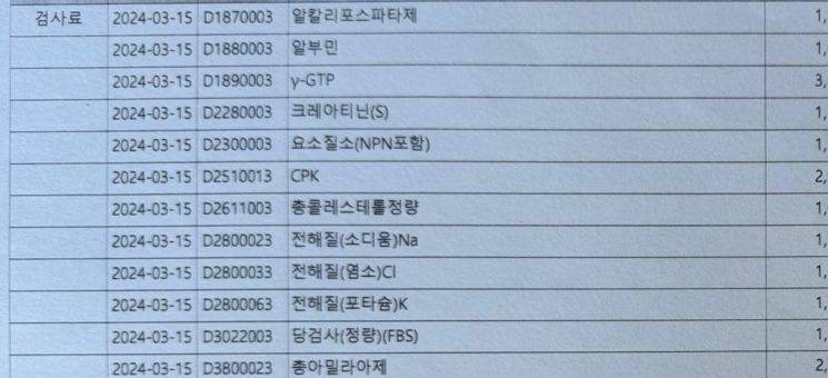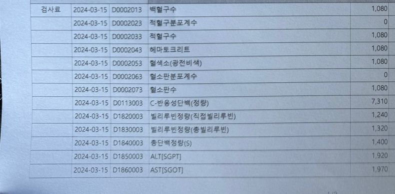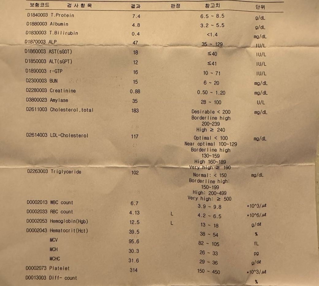 피검사 결과는 백혈구 수치, 적혈구 수치, 헤마토크리트, 혈소판, 간 기능 검사 (ALT, AST), 전해질 (나트륨, 칼륨, 염소), 그리고 콜레스테롤 등 여러 항목이 포함되어 있으며, 대부분의 결과가 정상 범위 내에 있어 큰 문제는 없어 보입니다.