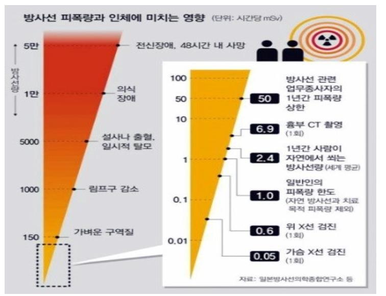 법적으로 피폭한도가 잇어서 이를 넘지않게 괸리하고
