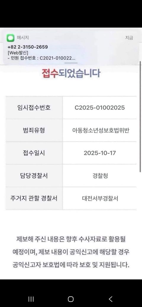 현재 상황은 아동청소년성보호법을 빙자한 합의금 사기의 전형적 수법으로 판단됩니다. 민원접수나 고소 진행을 사칭해 피해자의 공포심을 유발하고, 문화상품권 형태로 금전을 갈취한 행위는 실제 수사기관과 무관한 조직적 범죄 유형입니다. 따라서 실재 민원 접수가 아닌 단순 협박 또는 기망 행위로 보이며, 즉시 경찰에 신고하여 디지털 추적과 계정 확인을 요청하는 것이 우선입니다.법리 검토