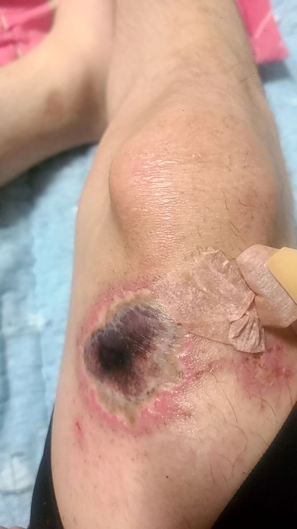 화학물질에 의한 손상이 점차 감소되고 있는 양상이긴 하지만 중간부분의 검게 변한 피부의 경우는 추후에도 피부착색이 남을 수 있어 우선 상처관리 후 제거 등이 필요할것으로 보여집니다.