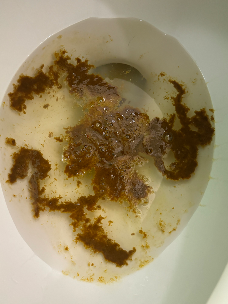 묽은 변이네요. 이러한 변이 악성병변의 징후일 수는 있지만 가능성은 높지 않습니다