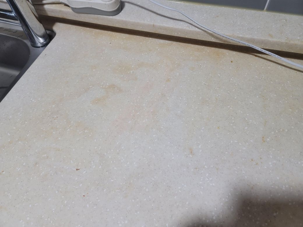 싱크대 상판 오염은 베이킹소다. 과탄산 소다 반반씩 섞어서 물에 푼뒤 반쪽처럼 만들어서 뿌립니다. 20분 후에 닦아내면 깨끗해집니다. 그저께 제가 청소한