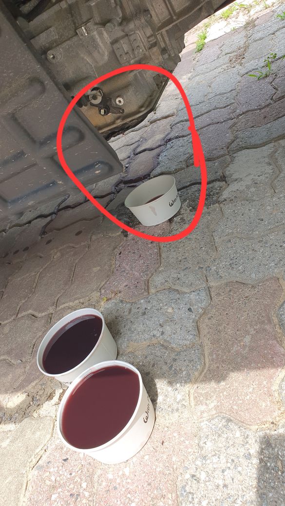 안녕하세요. 기운찬재칼262입니다. 미션 오일 팬이 주행 중에 찍힘으로 인해 미션 오일이 누유되는 것입니다. 미션오일은 빨간색이나 어두운 빨간색이며, 그림에 위치도 미션부분입니다. 보험사의 견인서비스를 이용하여 정비소에 입고 하여 수리하시는 것이 좋습니다.