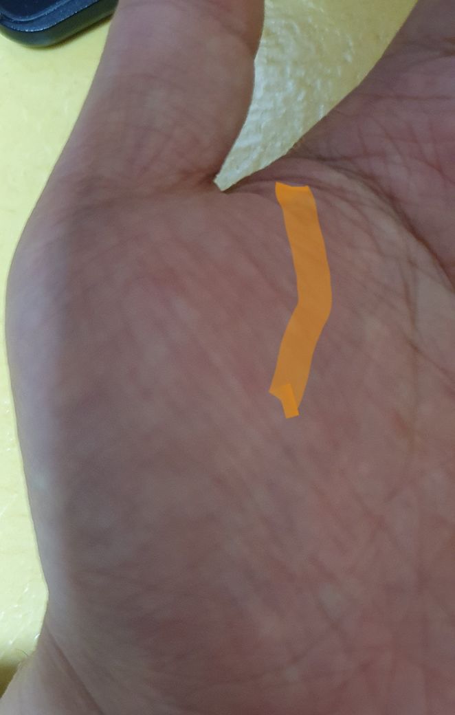 주황색으로 칠한 부분이 아파요. 엄지손가락을 손바닥쪽으로 붙일때는 통증이 없는데 손가락으로 바깥쪽으로 펼칠때 통증이 옵니다.