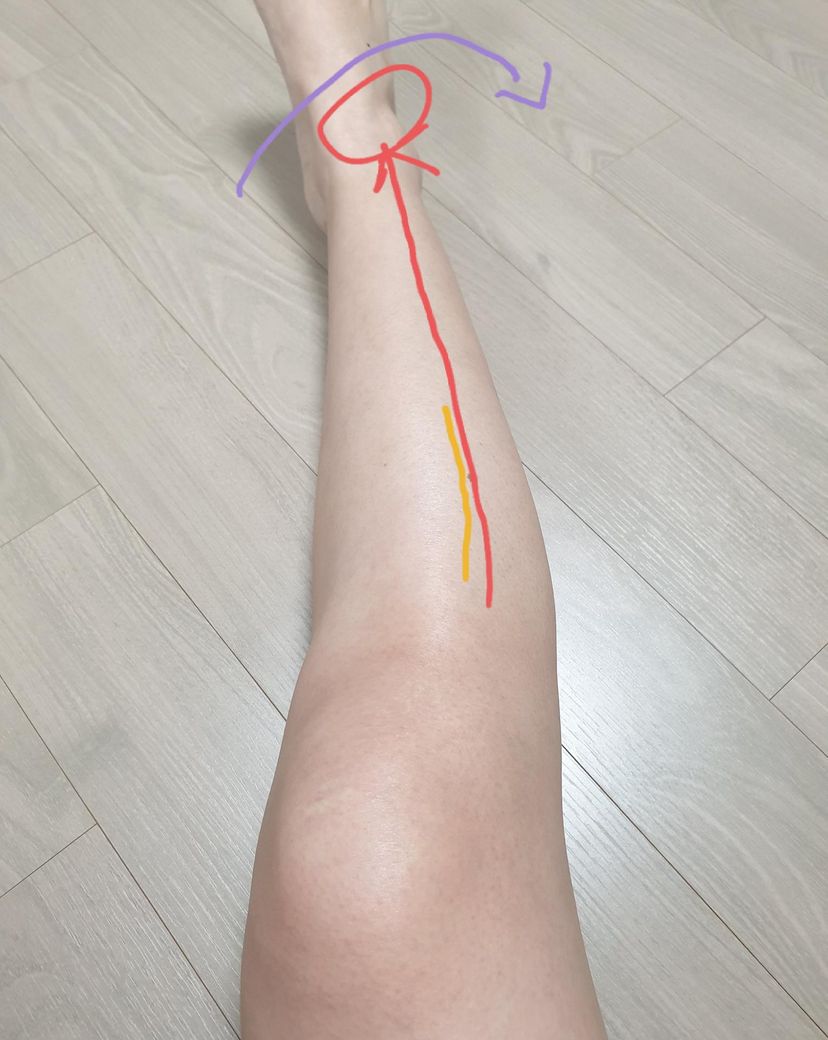 며칠전 길을 걷는데 정강이쪽 근육이 저린? 근육통증상이 생겨서 집에서 통증부분을 손으로 꾹꾹 눌러줬는데 (노란색) 그때부터 발목까지 통증이 타고 내려와서요 (빨간색) 발목쪽으로 스트레칭하듯 발목을 돌리거나 몸쪽으로 당기고 반대로해도 발목이 아파요 <오른쪽발목 인대쪽 뼈조각 있어요 몇년전부터 평상시 통증없고 예전보다 발을 삐는증상도 없거든요>