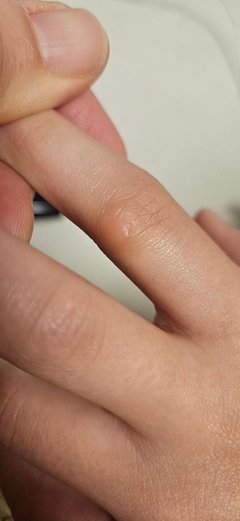 습관성 압박에 의한 국소적인 피부 변화나 조직 비대 가능성이 가장 높겠습니다. 반복적으로 물어뜯는 습관은 피부에 지속적 자극을 줘서 각질 비후나 섬유화, 국소 부종을 유발할 수 있습니다. 지금 손가락에 딱딱한 결절이나 색 변화, 통증이 없다면 염증성 변화보다는 기계적 자극에 의한 변형 가능성이 큽니다. 습관이 계속 유지되면 이런 변형이 고착되거나 관절 부위에도 영향을 줄 수 있으므로 습관 교정이 필요합니다.