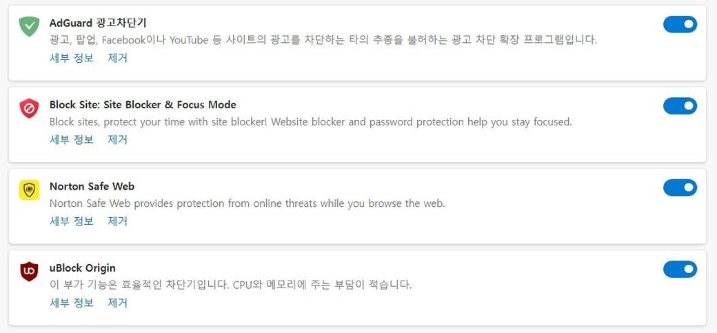 이 중에서는 유블록 오리진이 가장 가볍고 광고 차단 성능도 좋아요.