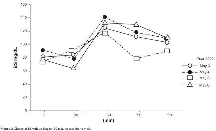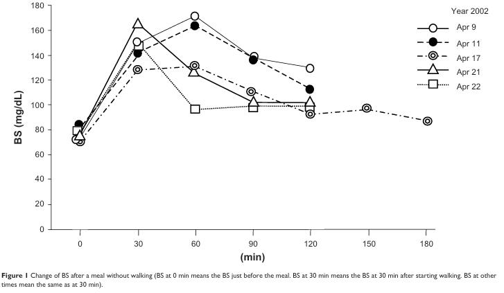 식후 바로 걸을 때 혈당이 낮게 유지되는 것이 확인할 수 있습니다.
