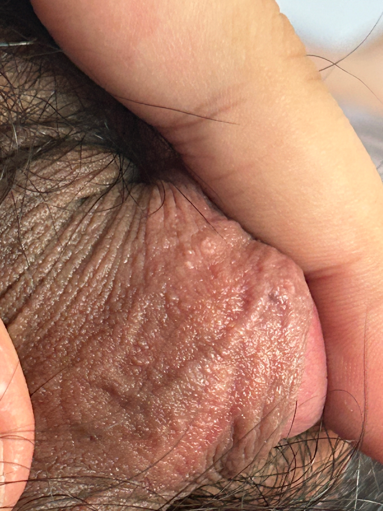 진주양 구진 및 헤르페스 병변의 가능성이 있기 때문에 비뇨기과에 내원하시어
