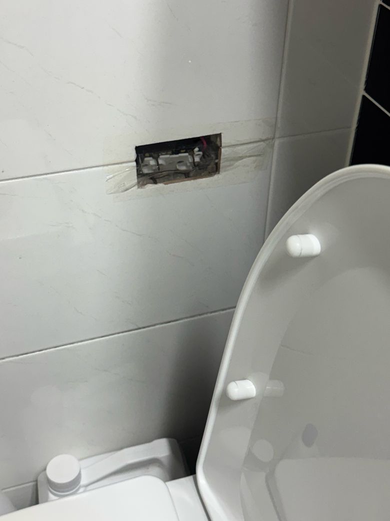 사진처럼 욕실 콘센트에 수분 유입 흔적이 있고 합선 후 전체 정전이 됐다면 매우 위험한 상태입니다. 콘센트 배선 철거 후 절연 보강과 바수형 자재로 재시공해야 하며, 그대로 방치하는 것은 화재 감전 위험이 큽니다.