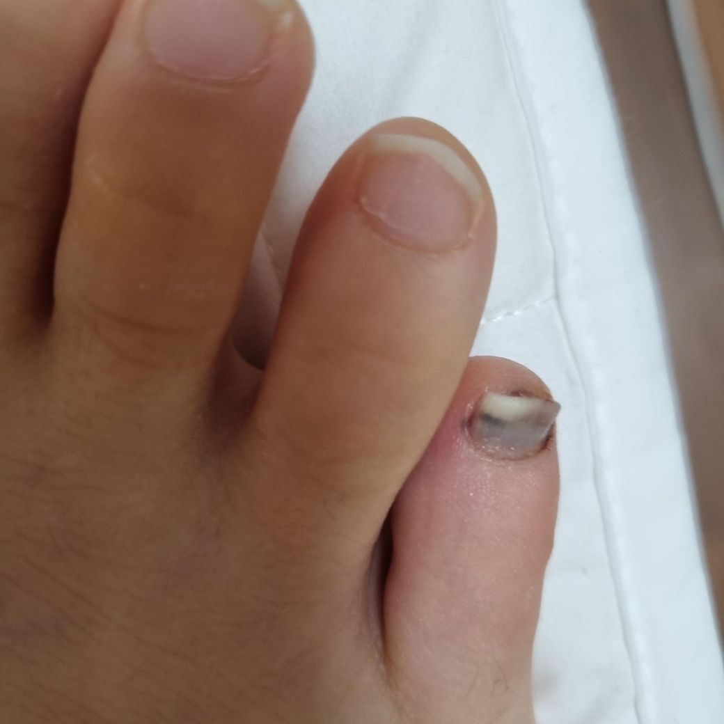 사진상 발톱 아래에 검게 보이는 부분은 외상 후 생기는 조갑하 혈종(subungual hematoma) 가능성이 가장 높습니다. 발을 강하게 부딪히면 발톱 아래의 작은 혈관이 터지면서 혈액이 고여 검거나 보라색으로 보일 수 있습니다. 질문처럼 처음에 피가 나고 하루 뒤 검게 변하는 양상이 전형적으로 나타납니다.
