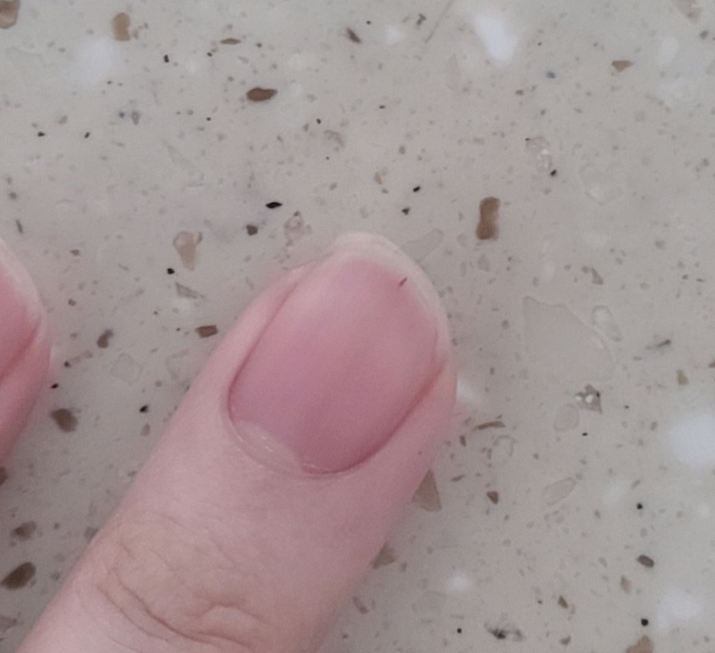 간혹 세로줄이 생기는 경우는 손톱을 만드는 네일매트리스의 멜라닌세포가 다양한 이유에 의해 자극받아 색소를 생산하는 경우가 있습니다. 주변의 색이 같이 변한다면 드물게 흑색종의 가능성이 있어 피부과 진료가 필요합니다.