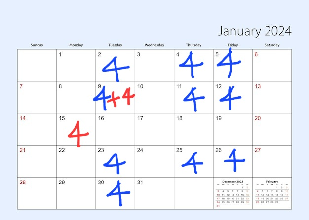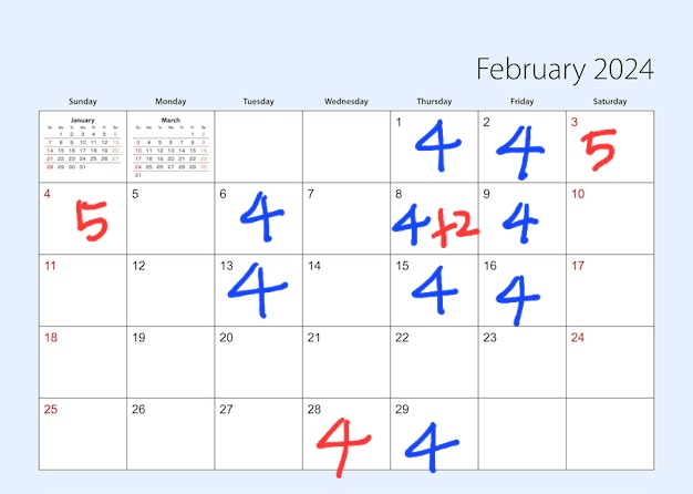 (근로시간을 정리해놓은 달력이며 빨간글씨가 연장근무, 대타입니다.)