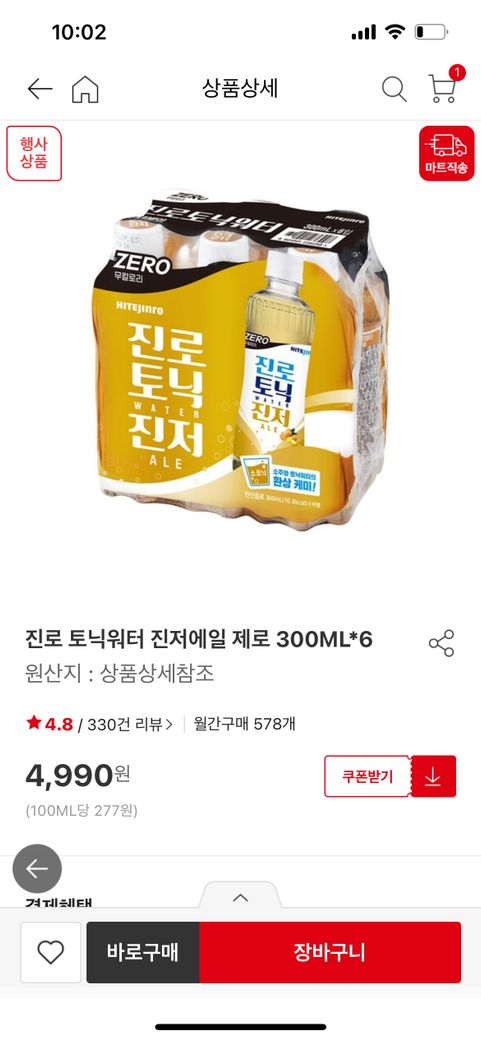 원래 하이볼 만들어먹을때 캐나다드라이 진저에일만 먹는데 집앞 마트에 진로 토닉워터 진저에일 밖에 없네요.. 둘이 맛 비슷할까요?