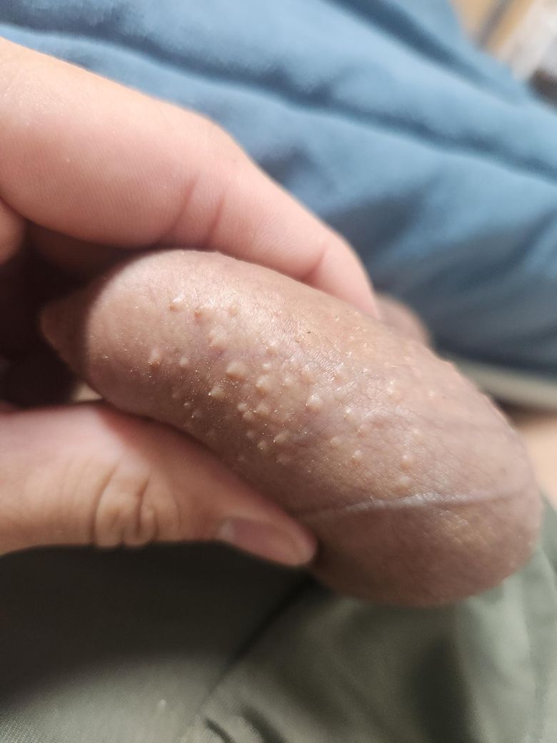 사진상 보이는 병변은 음경 몸통과 귀두 주변에 다수의 작은 피부색 돌기 형태로 분포하고 있고, 통증·가려움 없이 오래 지속된 점을 고려하면 가장 가능성이 높은 것은 정상 변이인 진주양 구진 또는 피지선 과다(포다이스 반점)입니다. 두 경우 모두 감염성 질환이나 성병과는 관련이 없고, 사춘기 이후 더 뚜렷해지는 경우가 많으며 수년 이상 변화 없이 유지되는 것이 특징입니다.