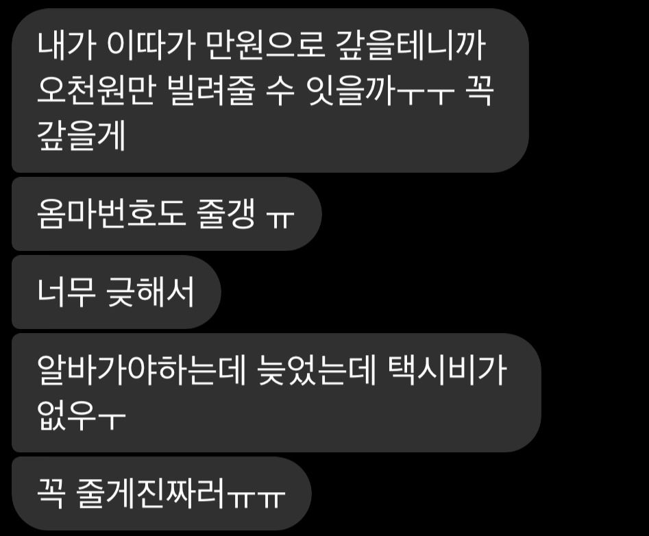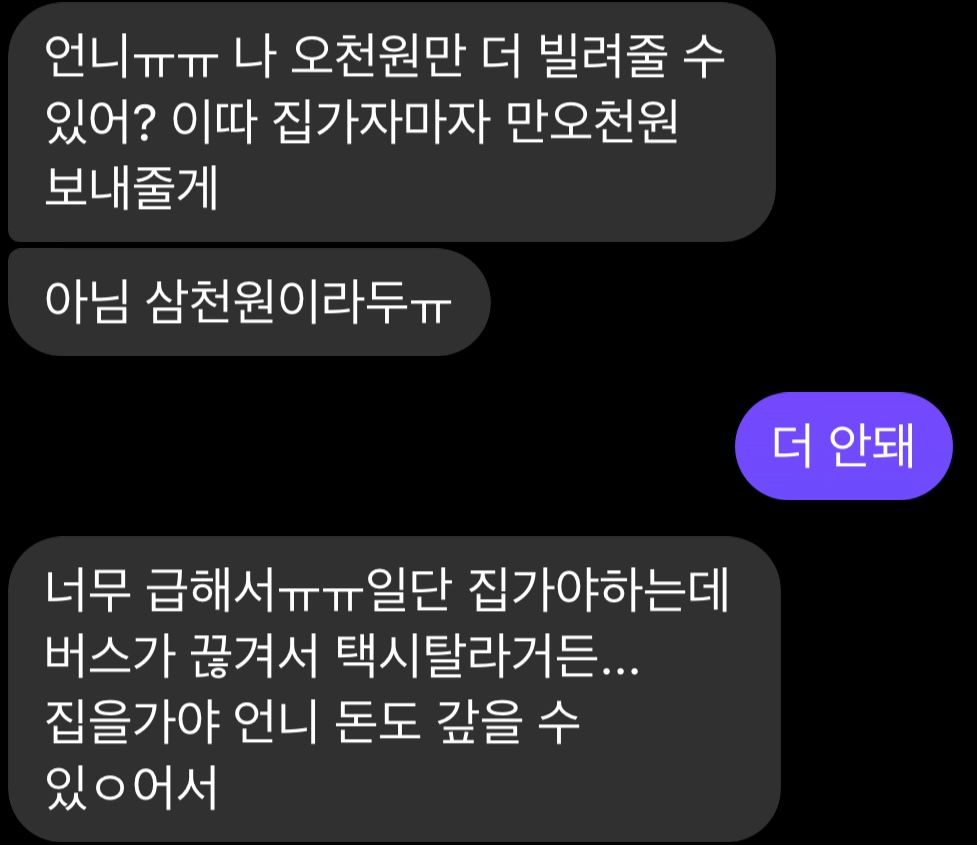 안녕하세요. 제가 아는 동생이 저한테 알바 가야하는데 택시비가 없다고 해서 오천원을 빌려주면 만원으로 갚는다하고 또 빌리고 아직 안 갚고 있는데 어떻게 해야하나요?
