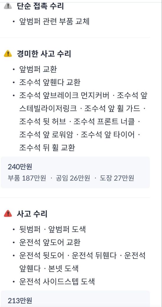 휠하우스나 뼈대 등등 사고이력 있는차는 피해라고 하는데 조회해보니 이정도 뜨고