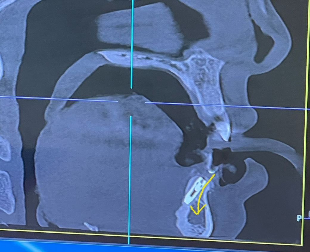 CT상으로 보면 저렇게 심어도 크게 상관은 없습니다. 오히려 표시하신 화살표 방향 아래쪽은 뼈가 물러서 그쪽을 피해서 심기도 합니다.