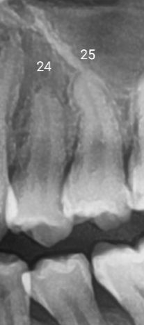 24번과 25번 사이에 인접면 충치가 있는 것처럼 방사선상에서는 보이고 있습니다.