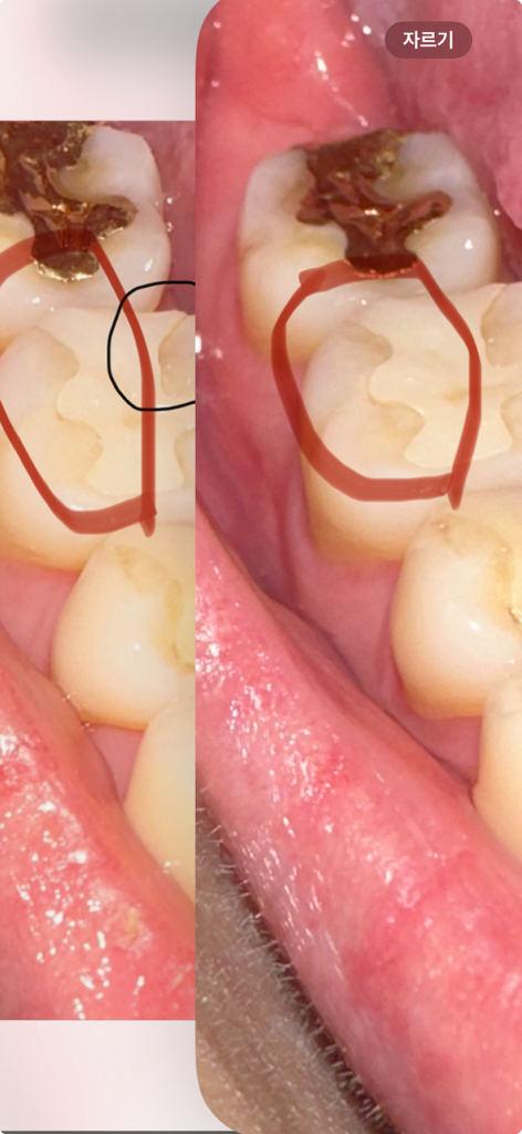 현재 사진상으로는 크게 문제가 되어 보이지는 않습니다. 하지만 현재 이물감이나 시리거나 통증 및 불편감이 나타나는 경우치과를 방문하여 진료를 받길 권합니다.