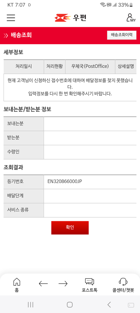 EMS 택배를 조회했는데 배달정보가 뜨지않아요