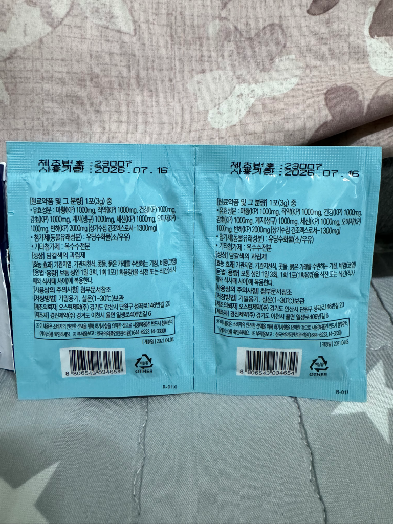 가장 가능성 있는 약은 아래의 한포씩 포장된 약입니다.