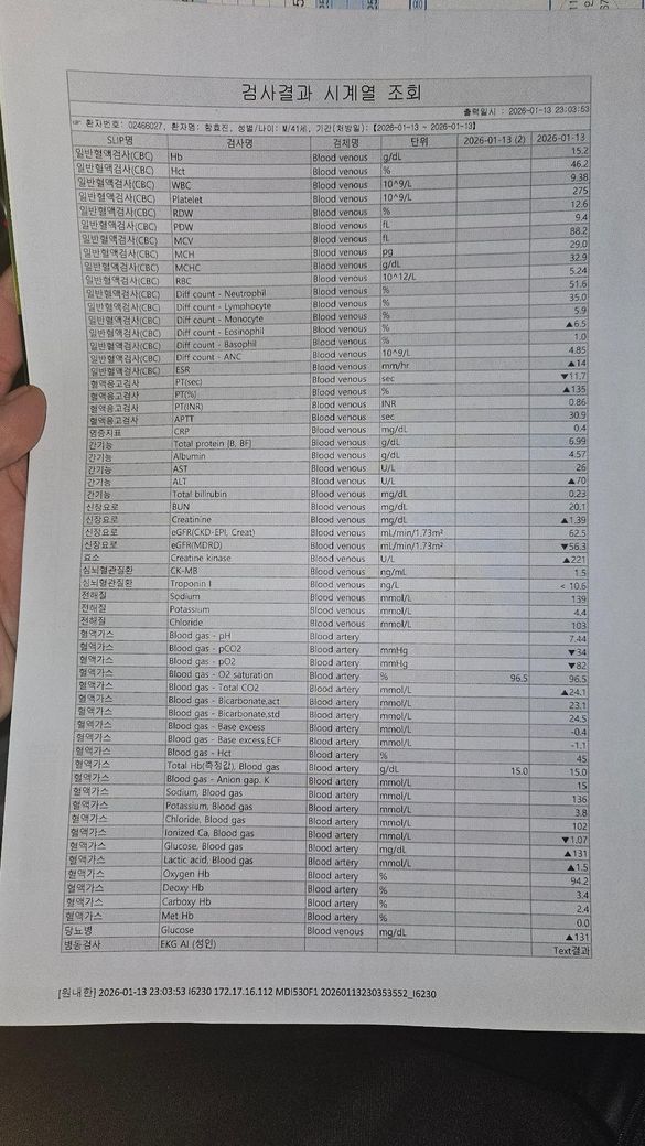 다만 몇 가지 눈에 띄는 부분이 있습니다. CK(근육효소)가 상승되어 있는데, 이는 격한 육체노동, 탈수, 근육 긴장, 일시적 저산소 상태에서도 흔히 올라갈 수 있으며 심장 특이 효소(CK-MB, 트로포닌)는 정상이라 심근 문제 가능성은 낮아 보입니다. 혈당이 130대 이상으로 약간 높게 나왔는데, 응급 상황이나 스트레스 상황에서는 흔히 나타날 수 있는 수치입니다. 동맥혈가스검사에서 pCO₂가 낮고 젖산(lactate)이 약간 상승해 있어, 당시 과호흡이나 일시적인 호흡 곤란·불안 반응이 있었을 가능성을 시사합니다.