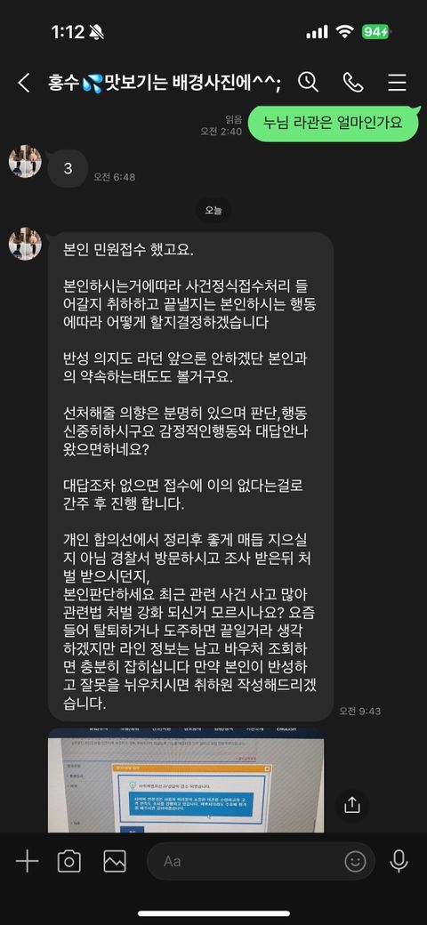 가격 문의만으로 곧바로 어떠한 범행의 실행에 착수하여 미수범이 성립하는 것도 아니고, 위와 같이 문자부터 보낸 걸 보면 애초부터 문자를 유도하여 합의 목적으로 공갈하려는 것일 가능성이 매우 높습니다.