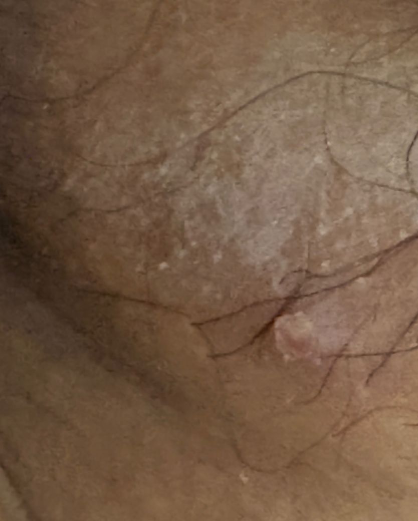 현재 병변은 단일 또는 소수의 둥근 구진 형태이며, 표면이 비교적 매끈하고 중심부 함몰이나 수포·미란 소견이 뚜렷하지 않습니다. 주변에 군집된 작은 물집이나 통증성 궤양도 보이지 않습니다. 이는 생식기 헤르페스의 전형적 초기 병태인 “다발성 군집 수포 → 빠른 파열 → 얕은 궤양” 경과와는 차이가 있습니다.